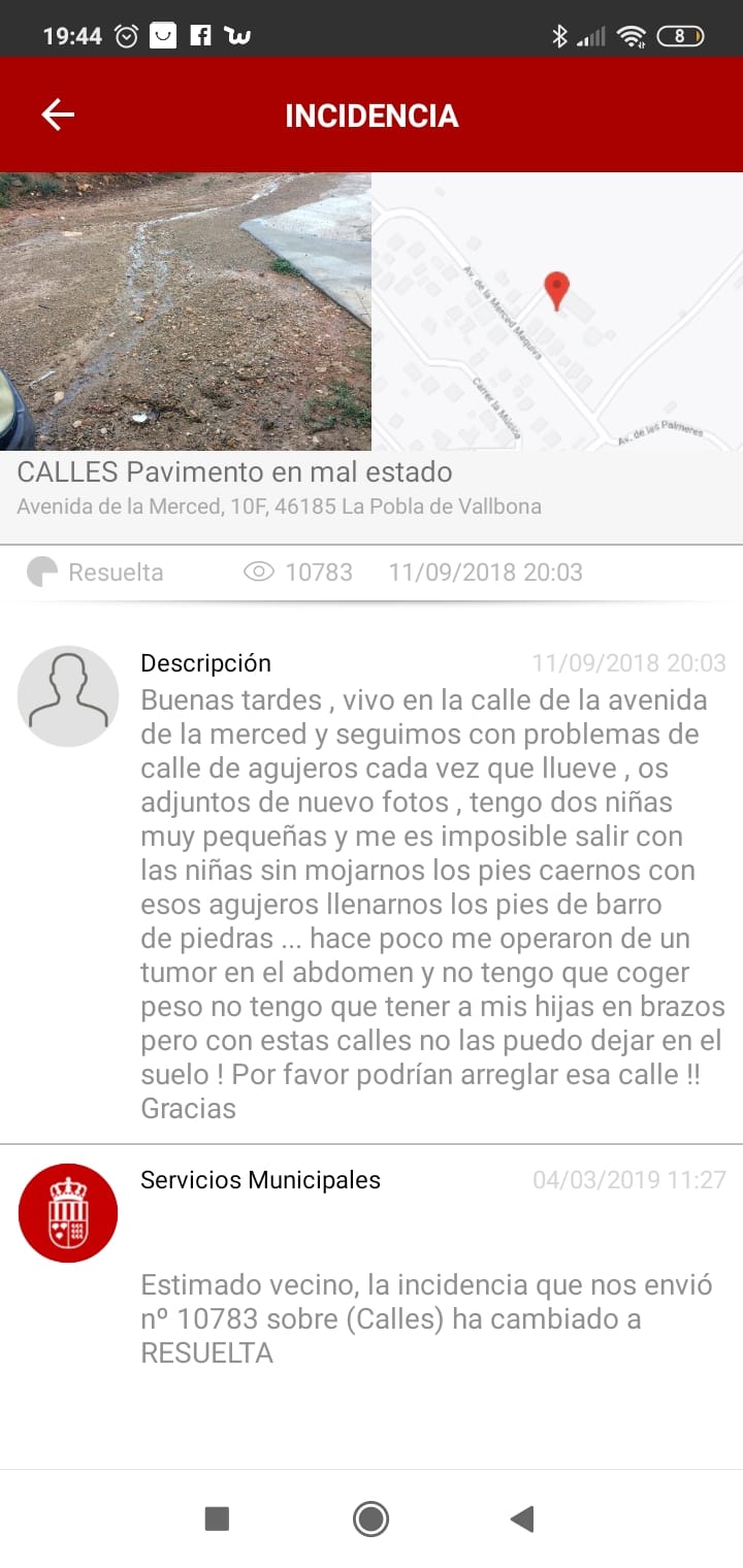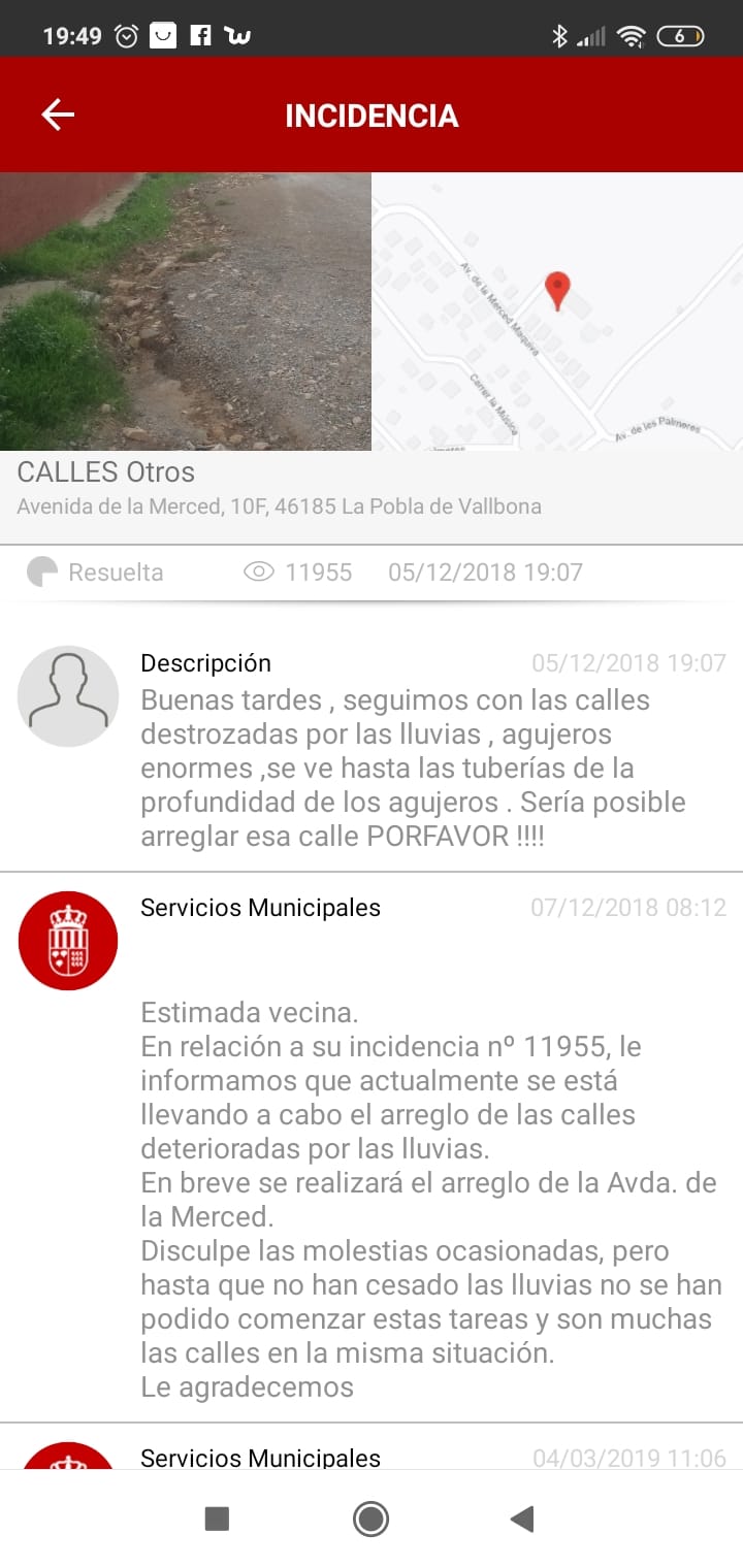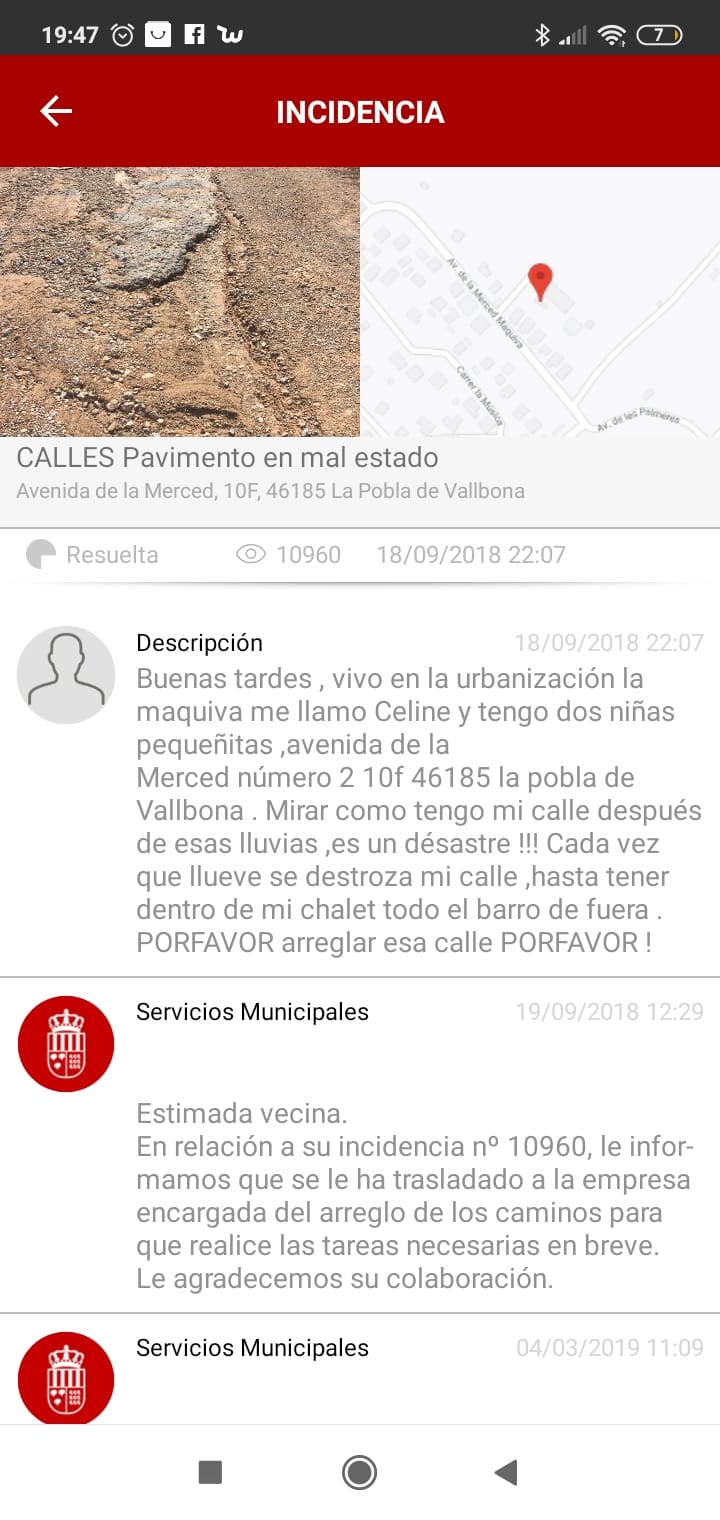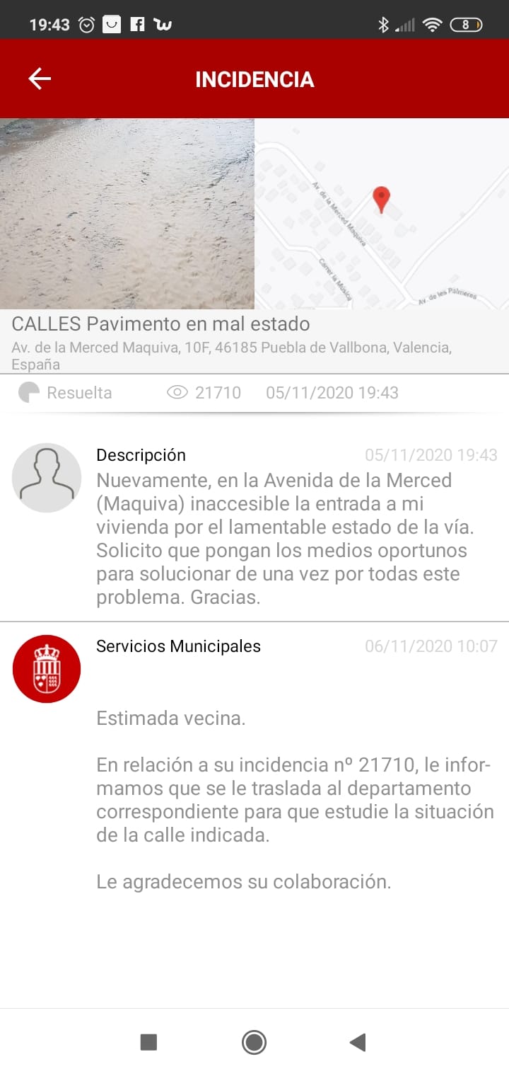 Nosotros desde aquí lo único que podemos hacer es seguir insistiendo en la resolución del problema por parte del ayuntamiento, y les pedimos desde aquí que escuchen al vecino, el cual ya ha presentado en multitud de ocasiones las incidencias pertinentes, a las que se le ha dado una solución temporal y no definitiva. Ya que cada vez que llueve, debido a la pendiente de la calle, el agua arrastra de nuevo las piedras y la tierra y deja al descubierto las canalizaciones de gas natural. Teniendo que ser algunos vecinos los que salen con azadas a intentar tapar los agujeros.